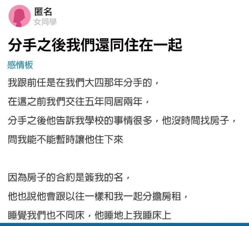 分手後依然同居,算什麼關係? 加入我們的Line群 「搞笑同樂會」,每天分享好多趣味影