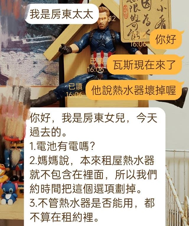 房東承諾附熱水器,入住後發現是壞掉的,反應後竟得到奇葩回覆… 網友在臉書社團上發文抱怨: