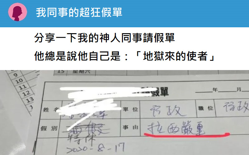 來分享一下我的神人同事請假單 他總是說他自己是:「地獄來的使者」 平時講話很多奇怪的形容詞, 常常神