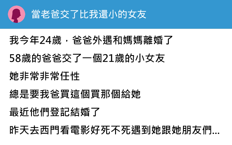 沒想到大家這麼關心我的遺產! 當初老爸外遇的時候 老媽有和他談些交換條件 因為老爸當初外遇的對象是人