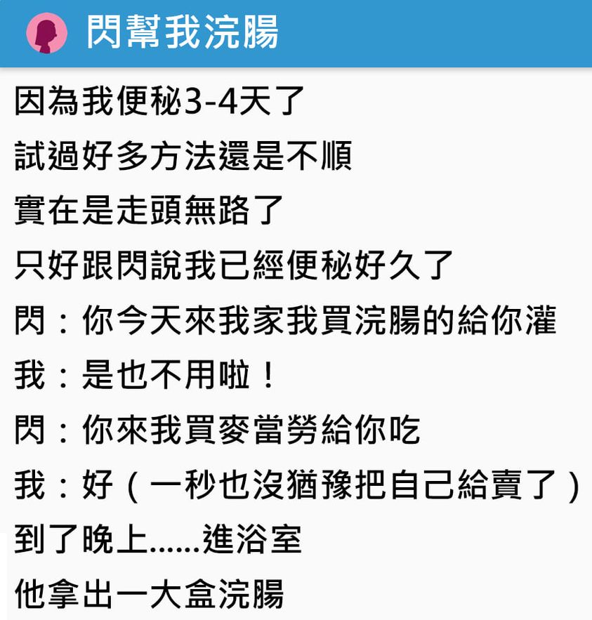 不知道大家如果便秘好幾天都怎麼辦呢? 有位女網友便祕好幾天跟男友說,結果男友做法真的讓她超羞恥但又超