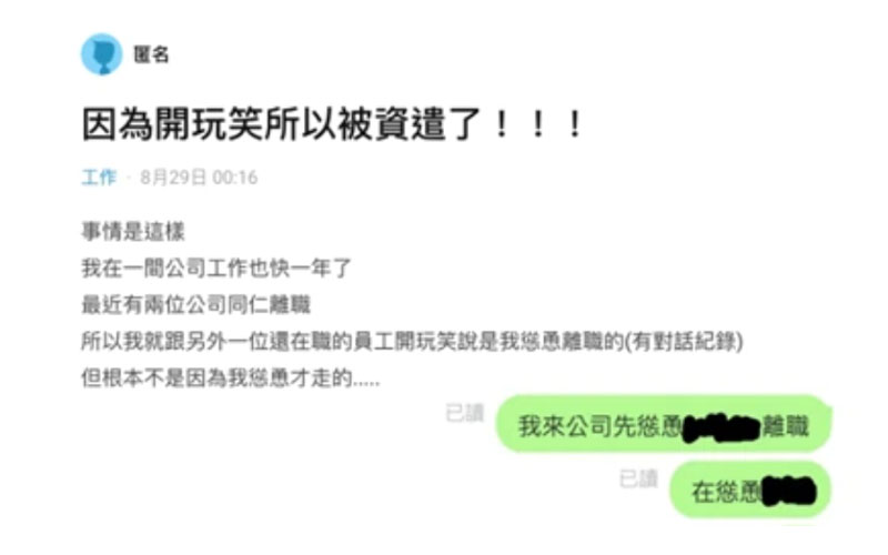 話不能亂講!一名網友在社群平台Dcard發文,自己跟同事開玩笑,說有兩名離職同事是自己慫恿才離開的,