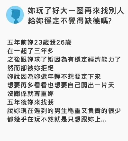 原文如下: 五年前妳23歲 我26歲,在一起了三年多,之後跟妳求了婚因為有穩定經濟能力了,然而卻被妳