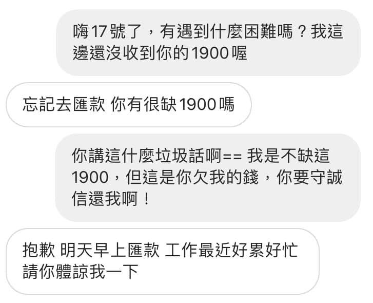 大家有被借錢不還過嗎?借錢真的是一件大學問,因為金錢而產生的紛 爭 也常常搞的彼此不 愉快。一位女網