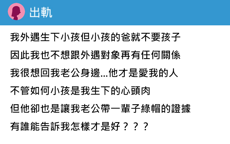 我出.軌生下小孩。 還沒有離婚小孩的爸就不要孩子 我也不想在跟外.遇對象有任何關係 我想回我老公身邊