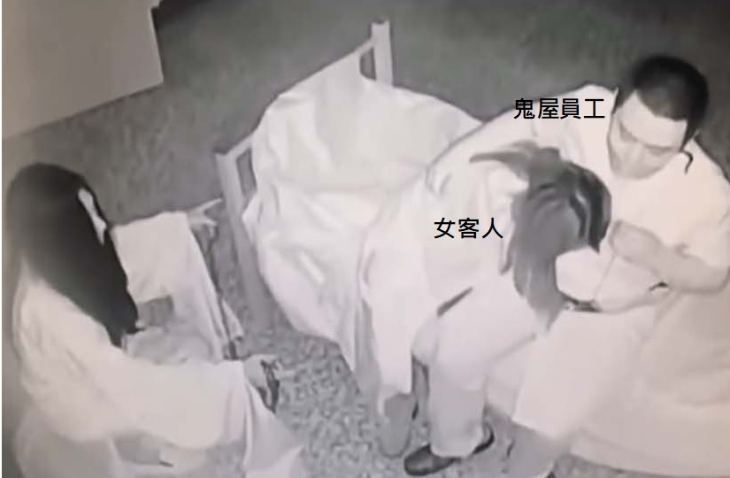 其實是因為這名女客人到鬼屋裡探險,卻因為太害怕而不敢完成任務,老闆娘看了便派工作人員進