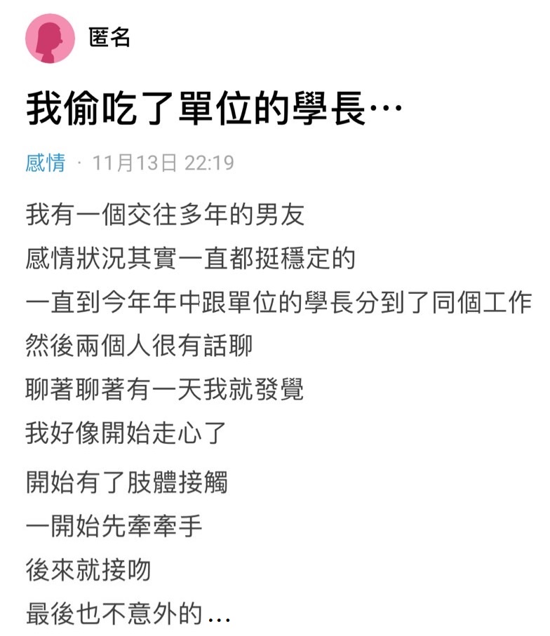 我偷吃了單位的學長…怎麼辦? 資料來源:Dcard 加入我們的Line群 「喵喵汪汪大
