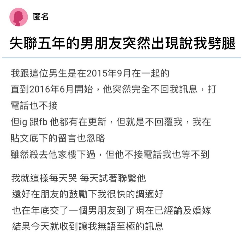 有論及婚嫁的對象,失聯的前任卻出現說我劈腿… 以下全文: 資料來源:Dcard &nb