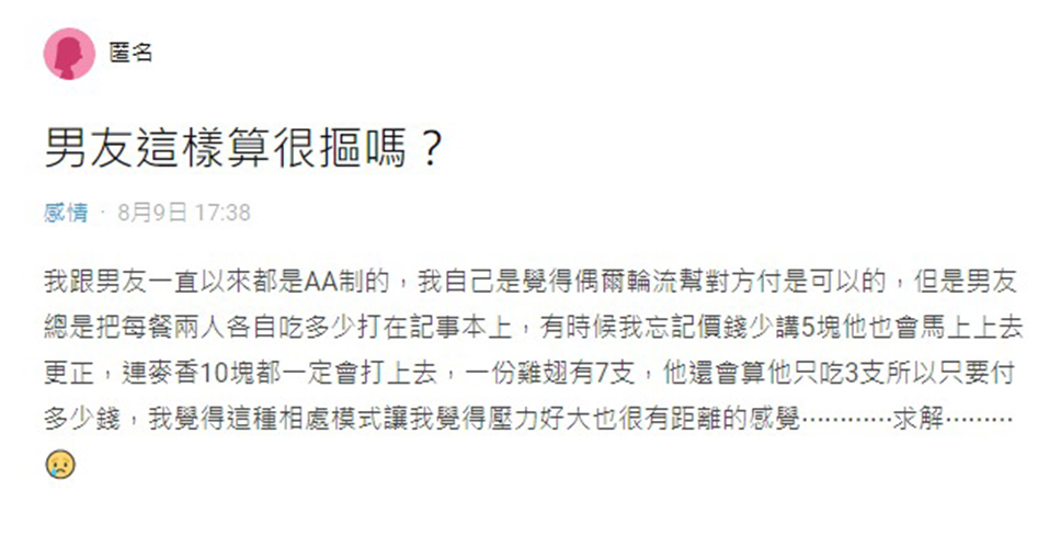 近年來提倡男女平等議題,然而男女在交往時,對於是否該執行「AA制」來平攤