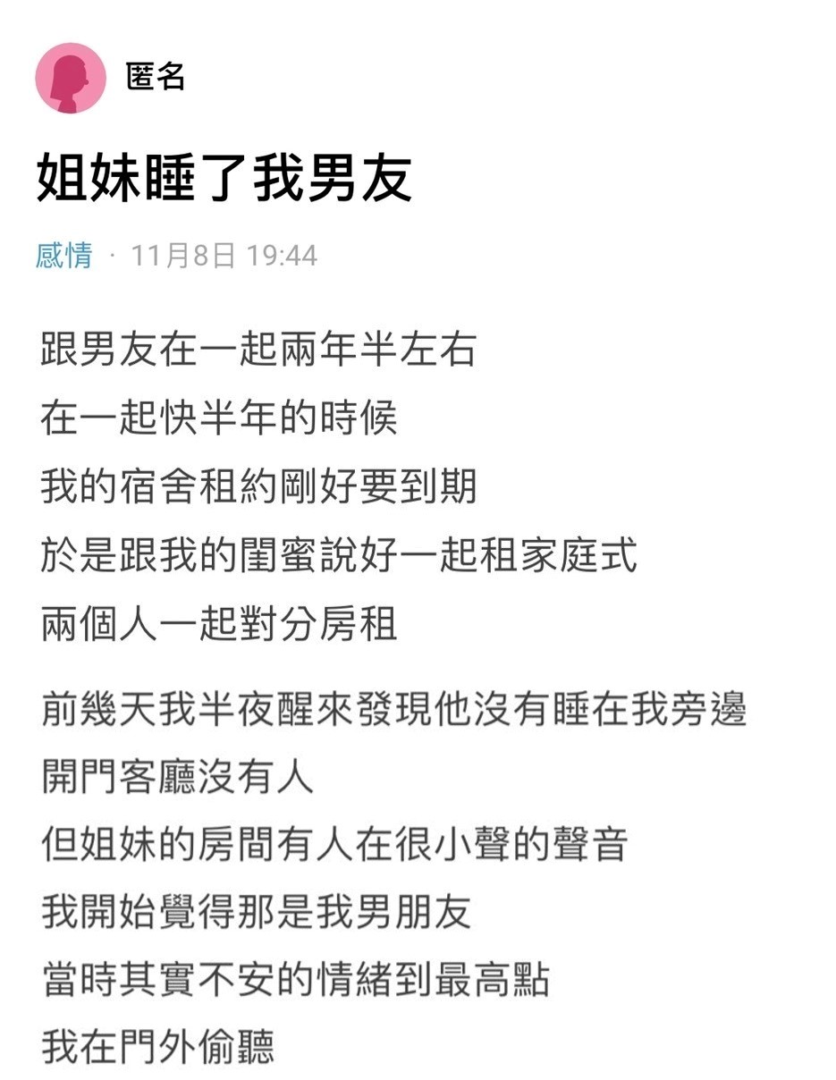 閨蜜和我男友睡了… ↓以下全文↓ 資料來源:Dcard 加