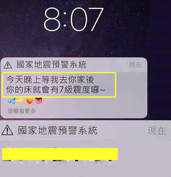– 國家地震警報傳的訊息是不是怪怪的 錯頻了吧 但這樣一發全國看光光 下一則更不得了了&