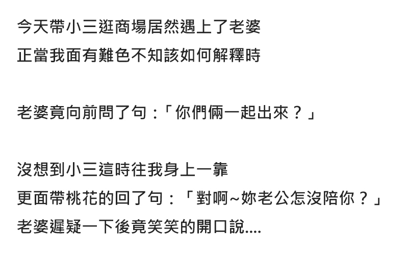 今天特地跟老婆說謊,陪我最愛的小三逛商場,沒想到逛著逛著…..居然碰上了我們家那隻母老虎了! 正當我