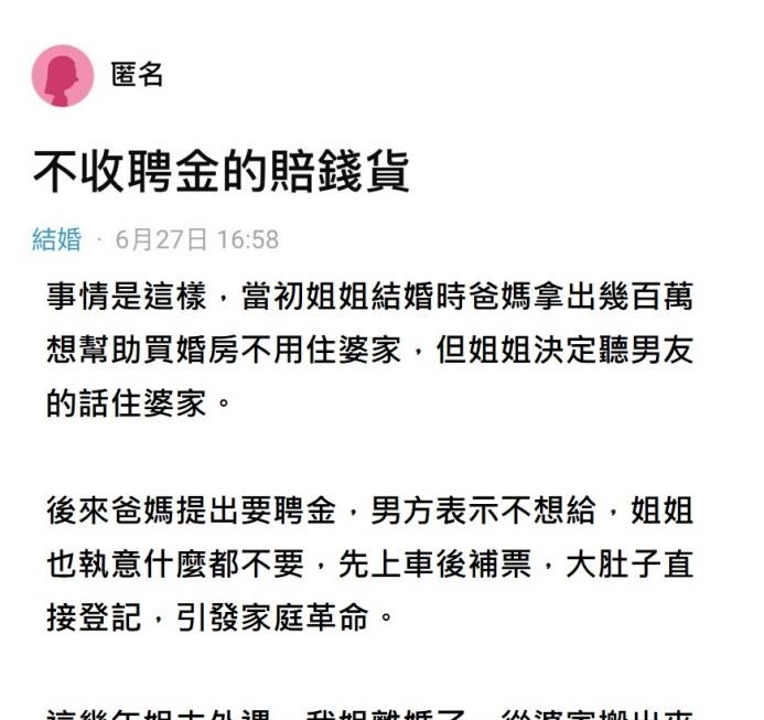 結婚不收聘金,被爸媽罵是賠錢貨… 全文如下: 加入我們的Line群 「搞