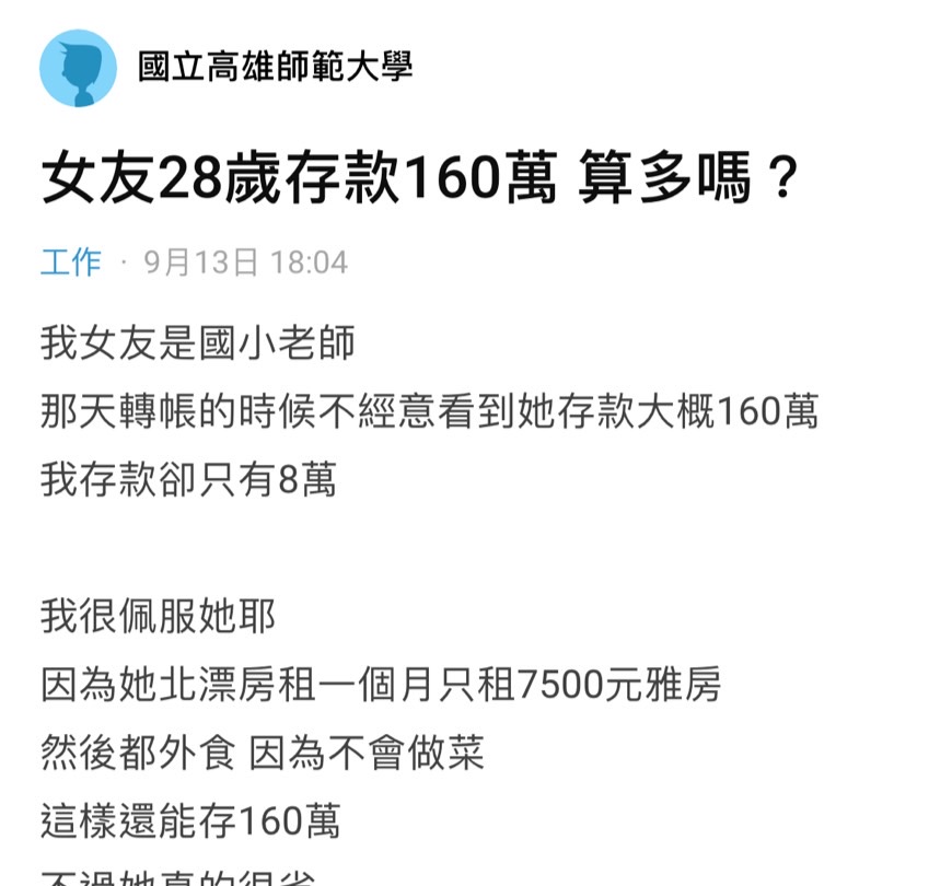女友28歲靠自己存款160萬…算多嗎? 資料來源:Dcard 加入我們的