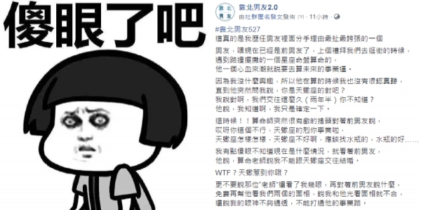 分手的理由真的是奇葩到看都看不完,因為女生素顏就提分手、看到女友摳指甲就分手、聽媽媽說分手就提分手等