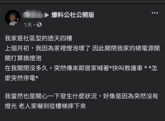 關自家總電源「鄰居摸黑重摔亡」!遭索賠560萬 他愣:我哪裡有過失? 關自家總電源換燈泡,卻吃上過失